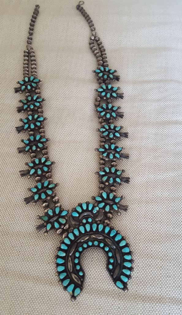 Unfortunately, there was just no market for the bulk of the items with the exception of a turquoise “blossom squash” necklace given to her in the 70’s. The auction house wanted that piece and included it in an auction held in Colorado that fall. It sold and Ginny received a few hundred dollars.