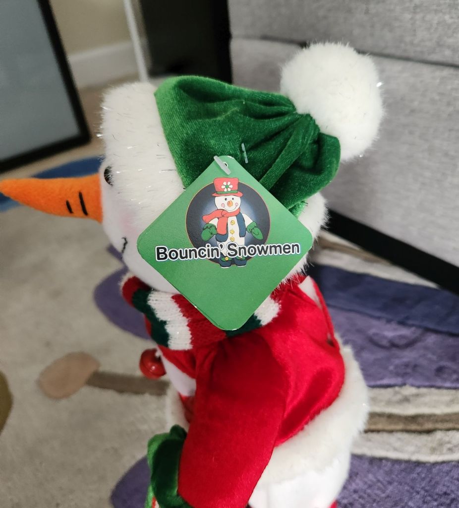 This snowman also had skills. With the words โPress Hereโ stitched on his left hand, we did just that and off he went into a goofy song singing โI am a snowman, catch me if you can, Iโm a bouncinโ snowman yes I amโฆโ making small hopping movements as he sang. But the surprise came at the end when he did a big jump forward, scaring all of us the first time.
